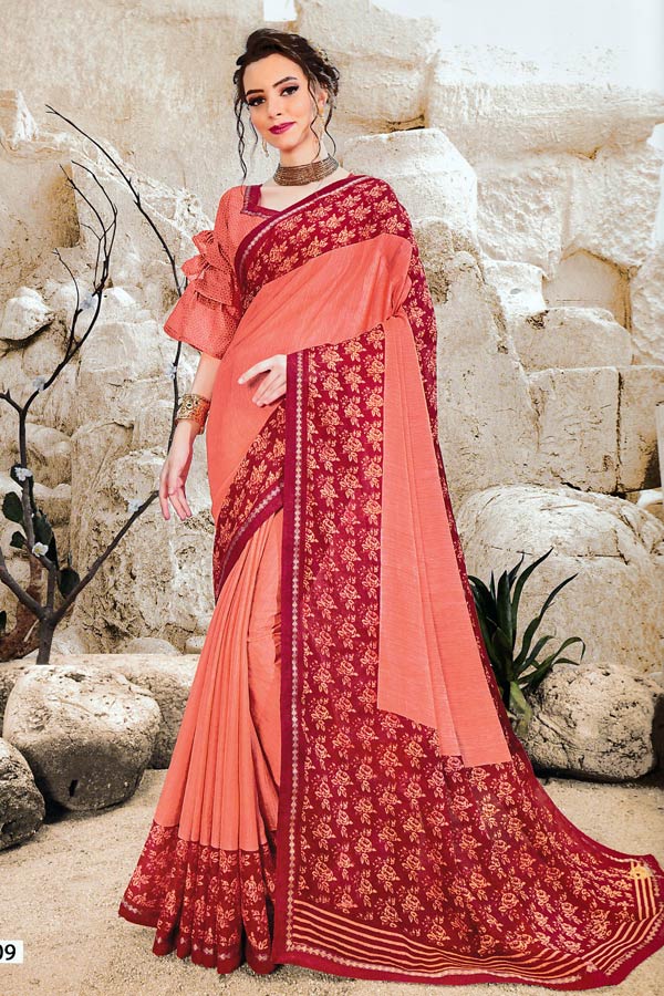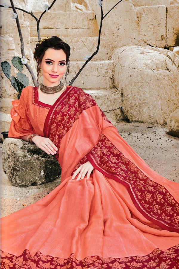 - Saree Color : Peach Color With Maroon Color Printed Border