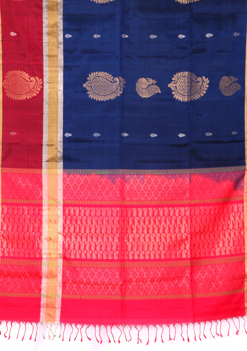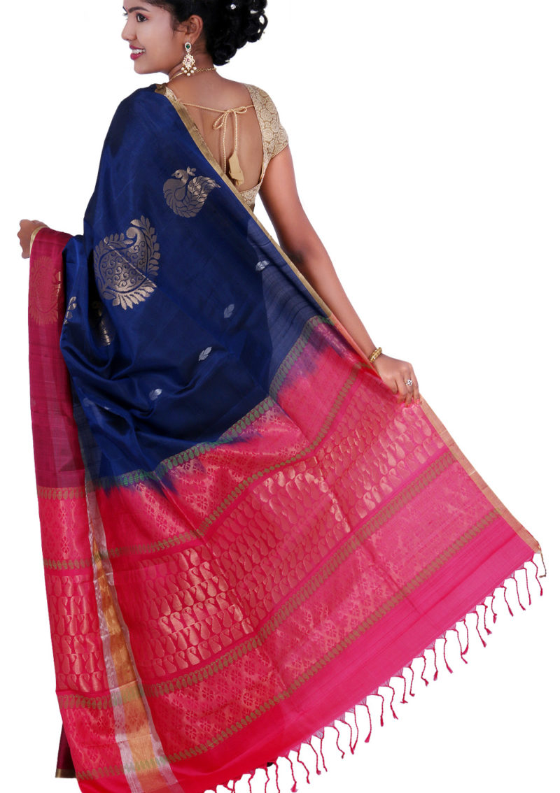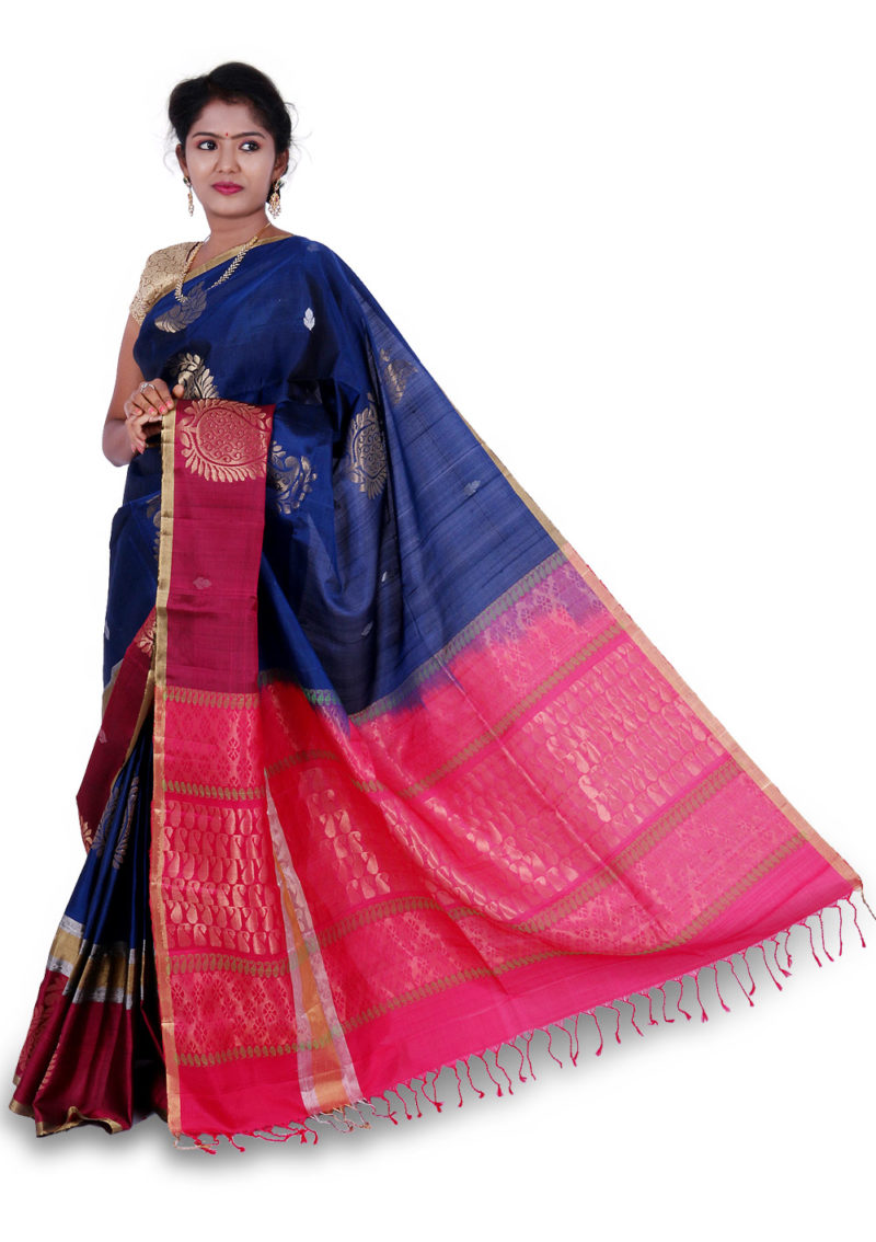 The product is weaved in the villages of South India made with the threads of Pure Mulberry Silk fabric. Saree Colour : Dark Blue With Pink Color Pallu. Body Design (Flower) : Zari and Silk Yarn Ideal for Festive occasional wears, Temple wears as well as Function wears, this Saree is soft, comfortable and drapes perfectly on your body