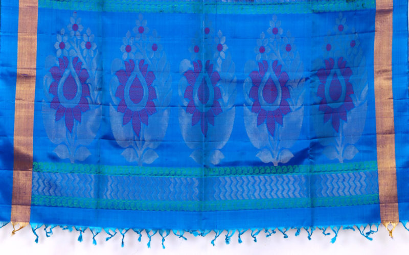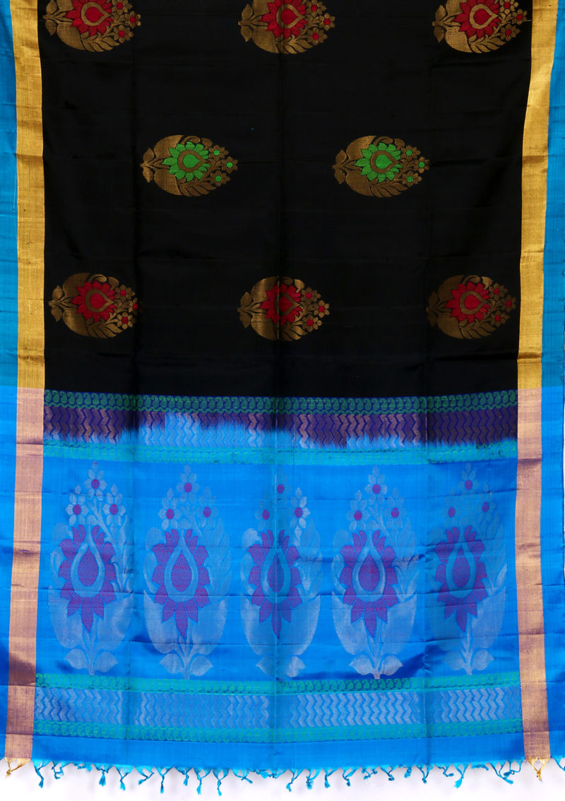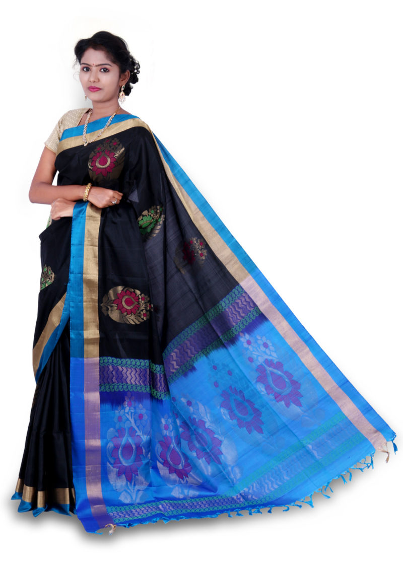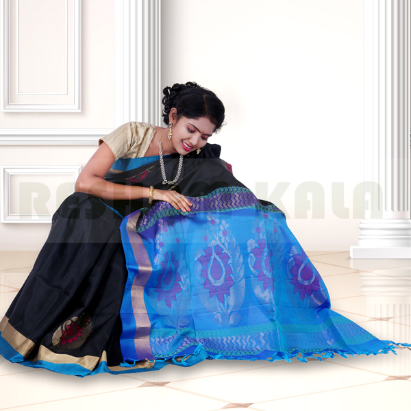 • The product is weaved in the villages of South India made with the threads of Pure Mulberry Silk fabric. • Saree Colour : Black With Blue Color Pallu. • Body Design (Flower) : Zari and Silk Yarn • Ideal for Festive occasional wears, • Temple wears as well as Function wears, this Saree is soft, comfortable and drapes perfectly on your body