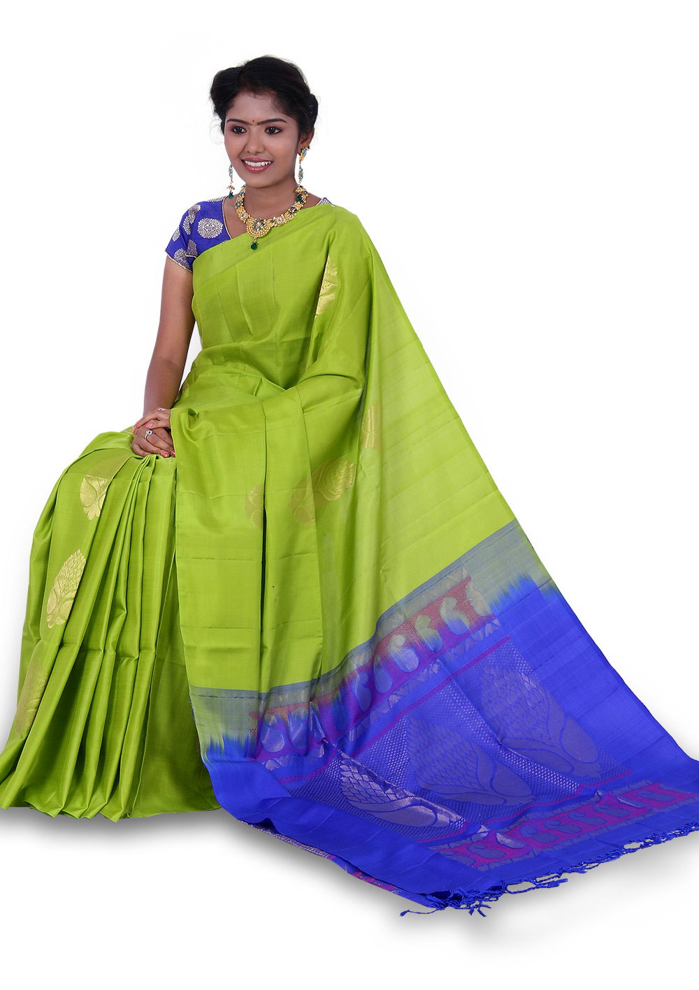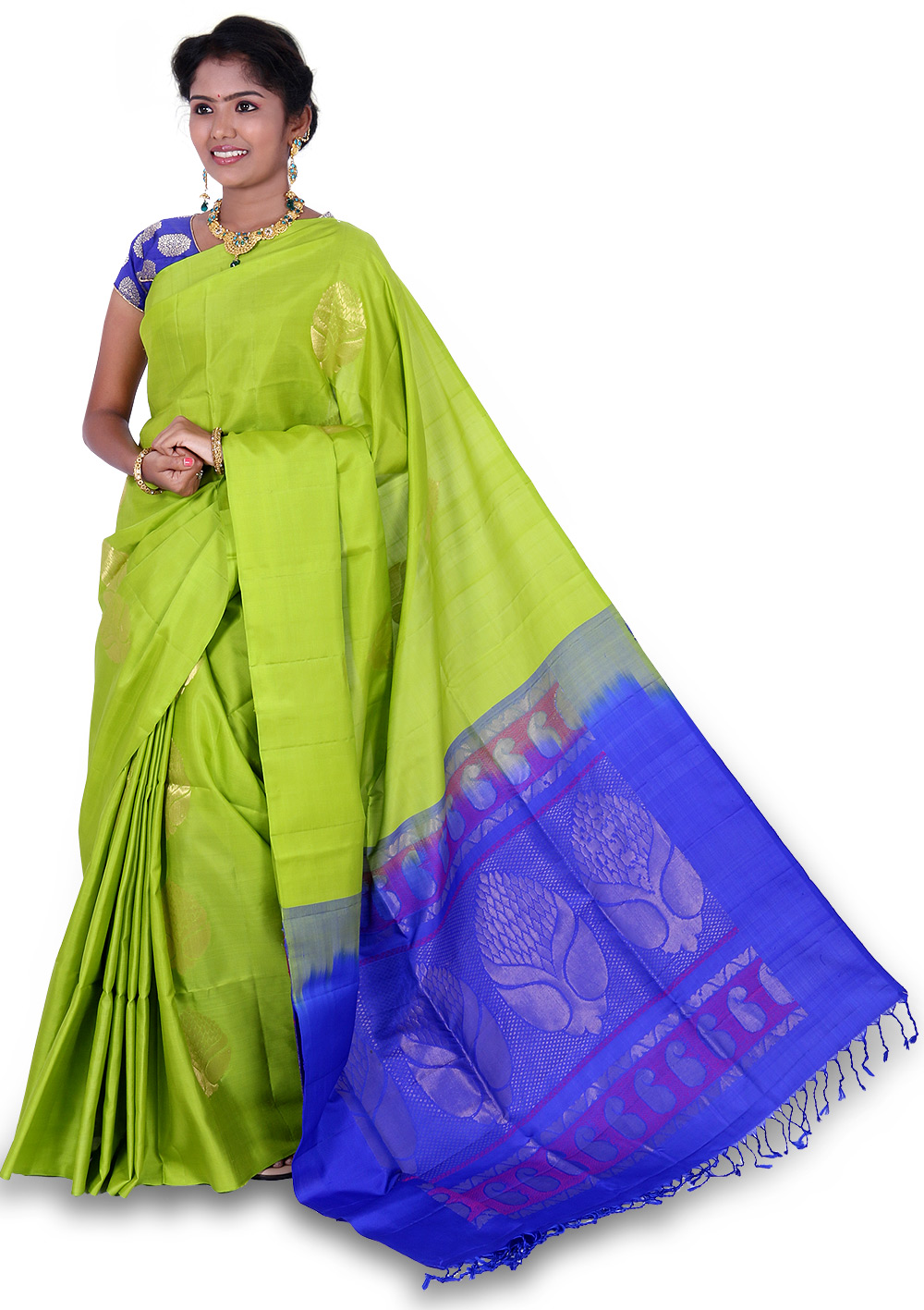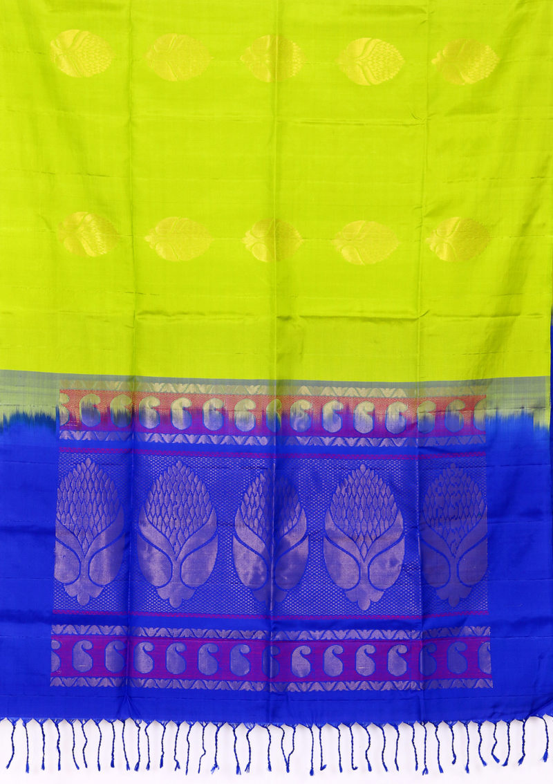 The product is weaved in the villages of South India made with the threads of Pure Mulberry Silk fabric. Saree Colour : Lemon Green With Dark Blue Color Pallu. Body Design (Flower) : Zari and Silk Yarn Ideal for Festive occasional wears, Temple wears as well as Function wears, this Saree is soft, comfortable and drapes perfectly on your body