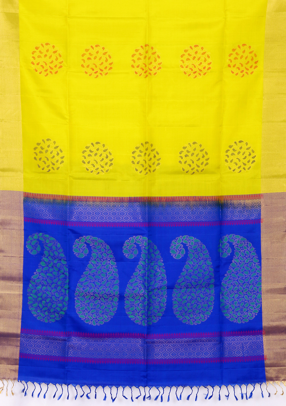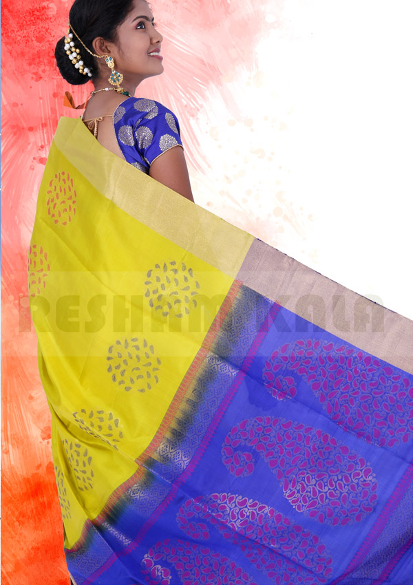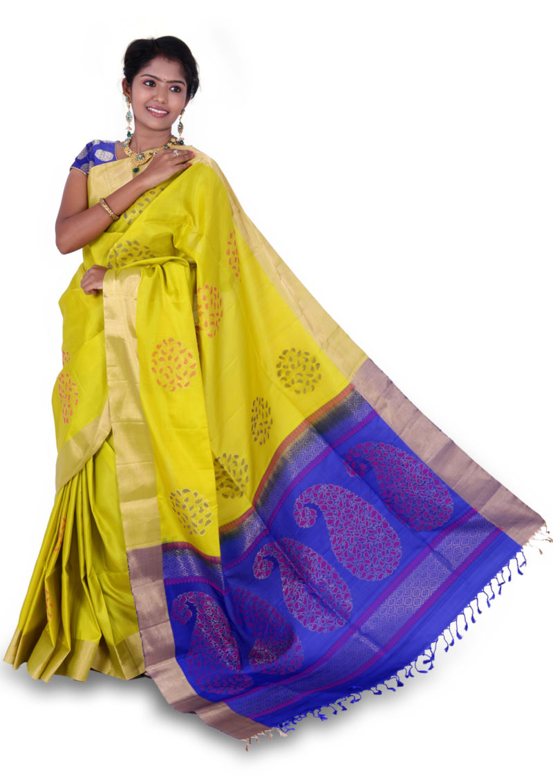 • The product is weaved in the villages of South India made with the threads of Pure Mulberry Silk fabric. • Saree Colour : With Blue Color Pallu. • Body Design (Flower) : Zari and Silk Yarn • Ideal for Festive occasional wears, • Temple wears as well as Function wears, this Saree is soft, comfortable and drapes perfectly on your body